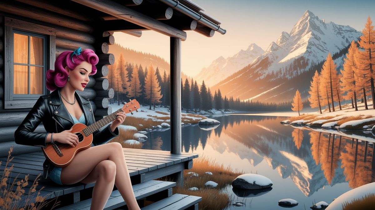A vibrant rockabilly pin-up strums a ukulele on a log cabin porch. Golden autumn trees surround a calm alpine lake with snow-capped mountains, all bathed in soft sunrise light in an illustrative style.