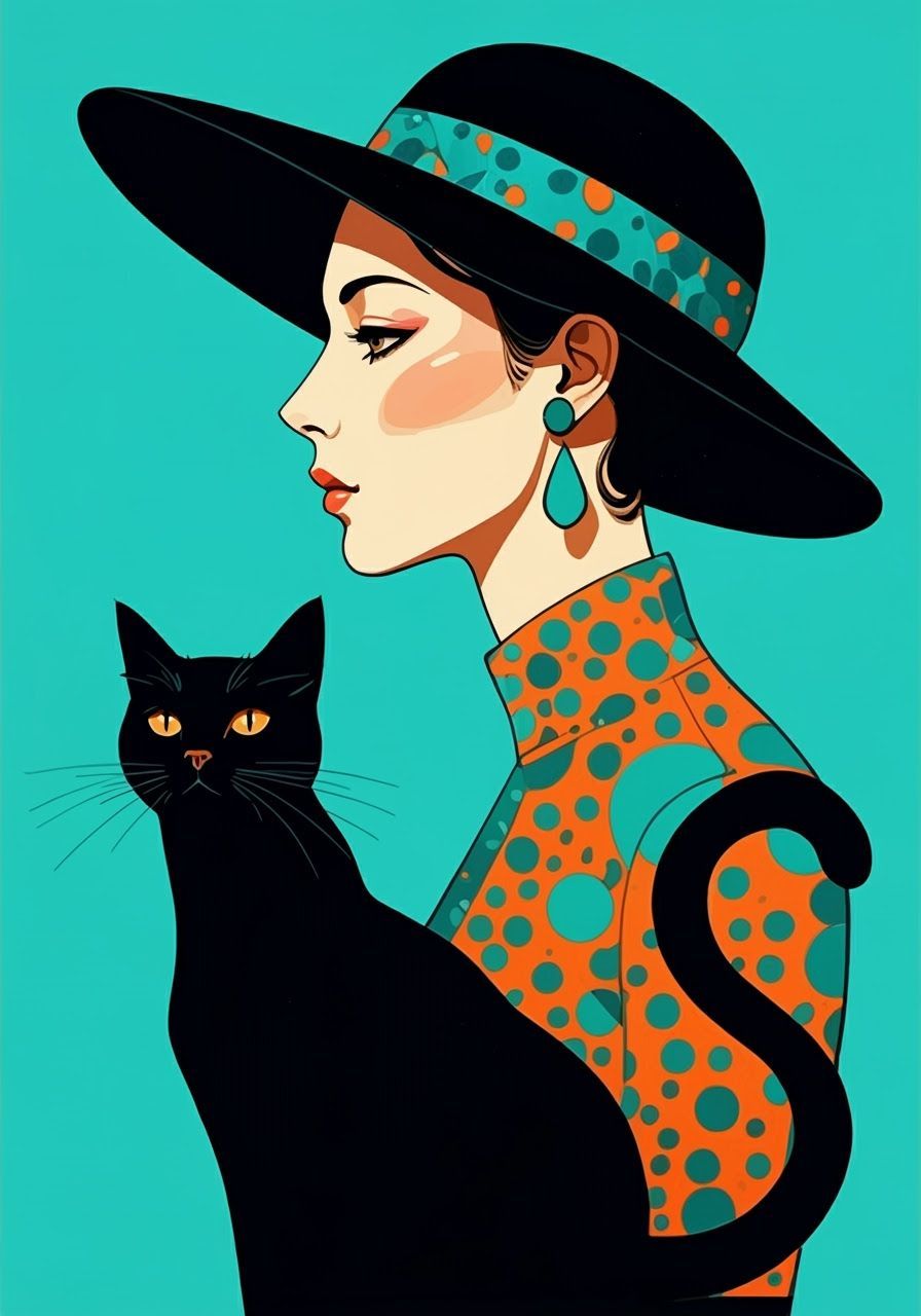 This image shows a stylish woman in profile with a sleek black cat. She wears a wide-brimmed hat and polka-dot top against a turquoise backdrop, rendered with bold lines and whimsical elegance.