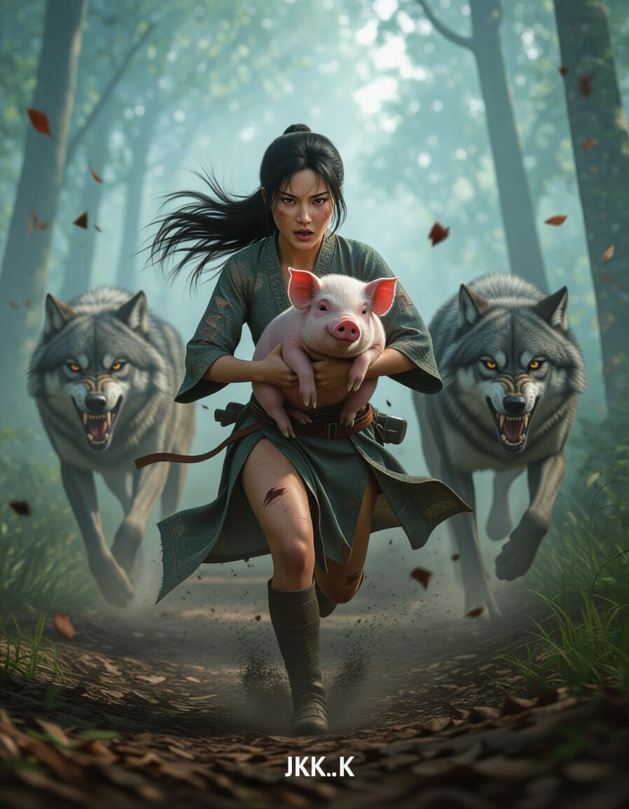 This image shows a determined Asian woman fleeing through a misty forest, clutching a piglet. She is pursued by two large wolves with glowing eyes in a cinematic style, rendered in ultra-high definition.