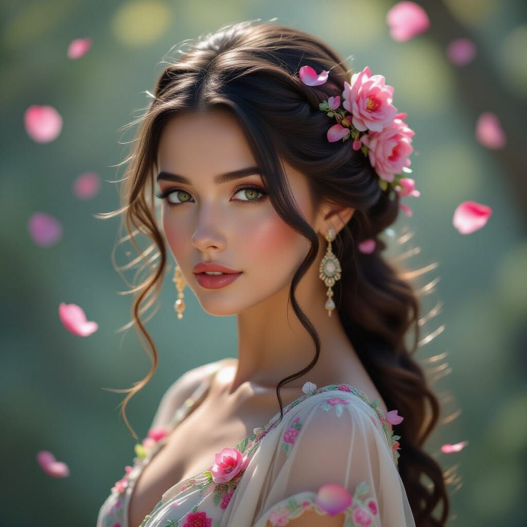 A portrait of a beautiful woman adorned with flowers. The image is a matte painting with rich color and intricate detail, reminiscent of fantastical concept art.