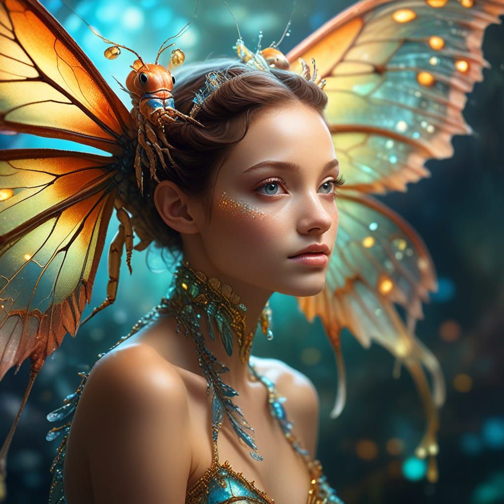 A close-up image of a fantastical hybrid creature with features of a harlequin moth, mantis shrimp, and a woman. Shimmering iridescent wings and soft mist create a dreamy, ethereal atmosphere in a Kinkade-style.