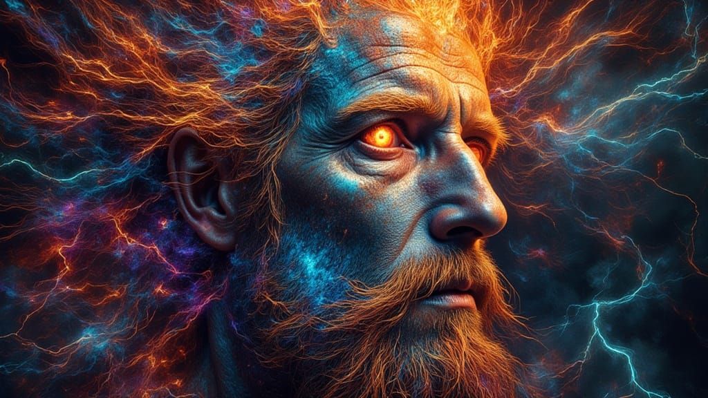 A striking picture of a ghostly figure with rainbow eyes and flames emanating from its head. The image features fractal art, sacred geometry, and iridescent colors, in a psychedelic digital painting style.