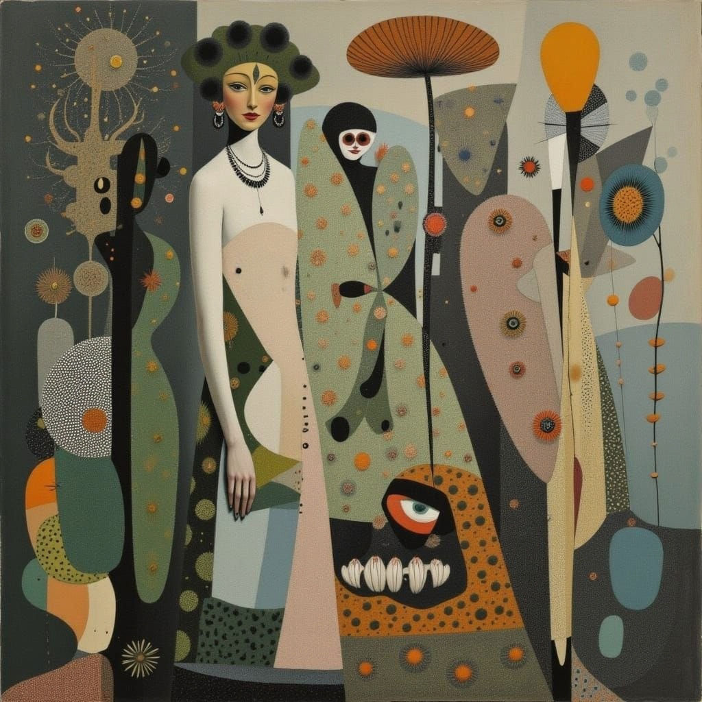 This image showcases abstract figures rendered in a distinct vellum artistic style. The composition explores unique textures and forms.