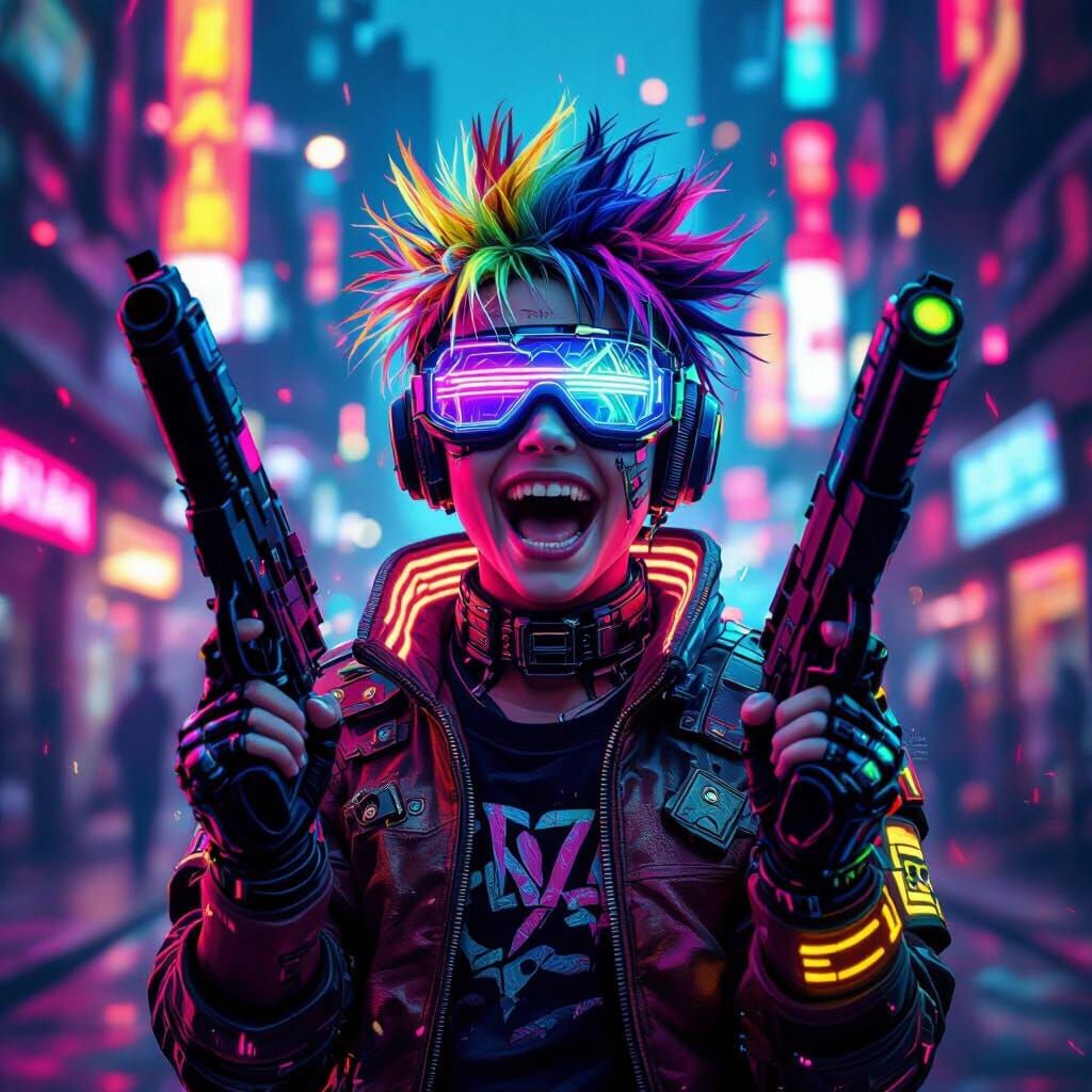 A digital illustration of a cyberpunk youth with vibrant spiked hair and cybernetic enhancements. The scene, set in a neon-lit cityscape, features glitch effects and high contrast colors in a futuristic style.