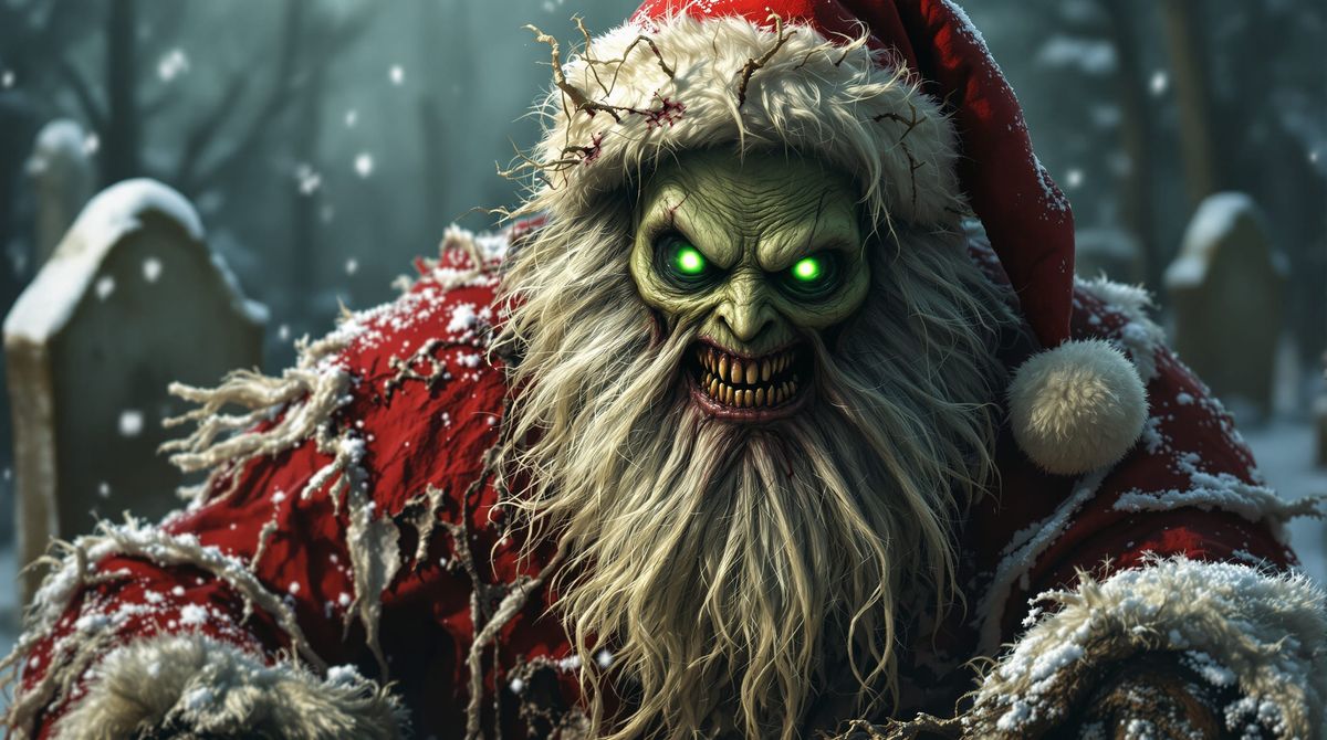 This image depicts a decaying Santa Claus with glowing green eyes and a wicked smile, shambling through a snowy graveyard. The art style blends dark whimsy and macabre detail.