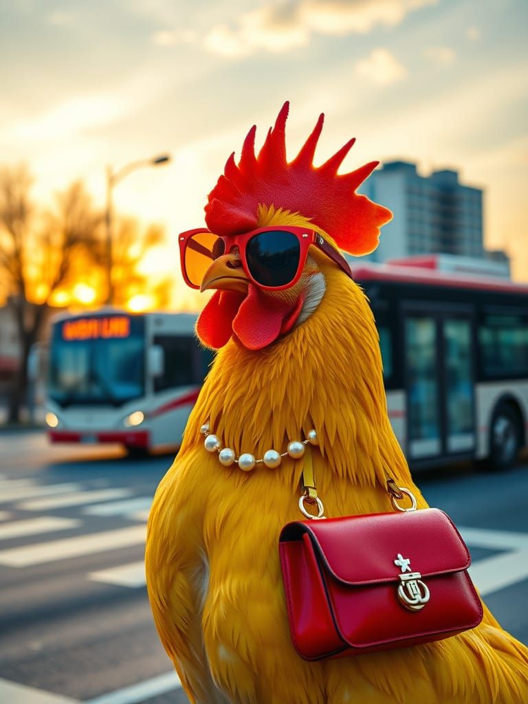 This image shows a stylish yellow hen sporting sunglasses and pearls, carrying a red purse. The backdrop is a cold cityscape at sunrise with a Soviet bus, captured with cinematic lighting and bold colors in a cel-shaded aesthetic.