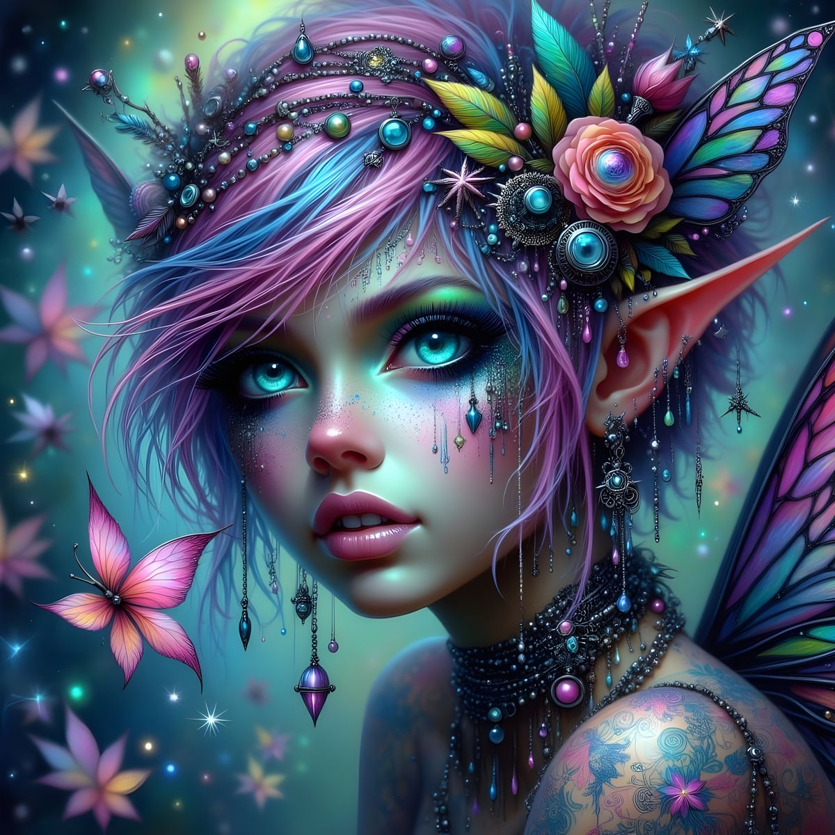 This image showcases a beautiful fairy woman with striking big eyes, her face and head elegantly decorated with vibrant, colorful jewels. The style evokes a whimsical fairy punk aesthetic.