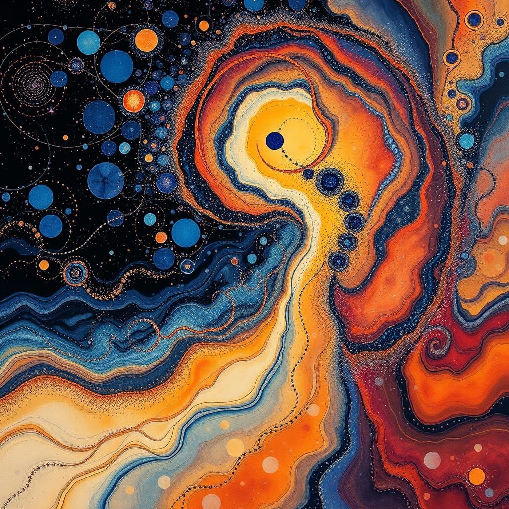 A captivating image of a lady dancing in a vibrant, psychedelic fractal universe. Features a blend of ink wash, dot painting, and silk art techniques with ethereal, dreamy qualities.