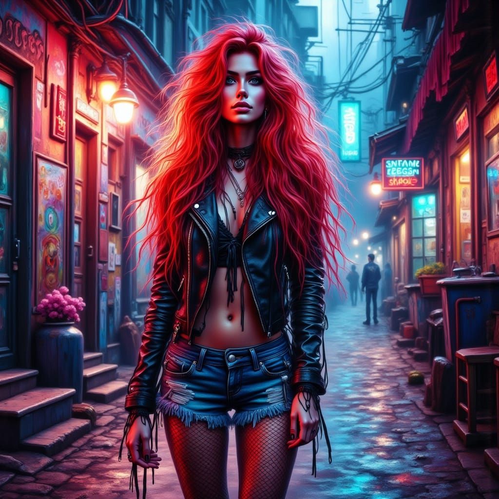 A striking picture of a red-haired woman in a cyberpunk aesthetic. She stands in a neon-lit alleyway with holographic ads and graffiti. The image is rendered in hyperrealistic style with vibrant colors.