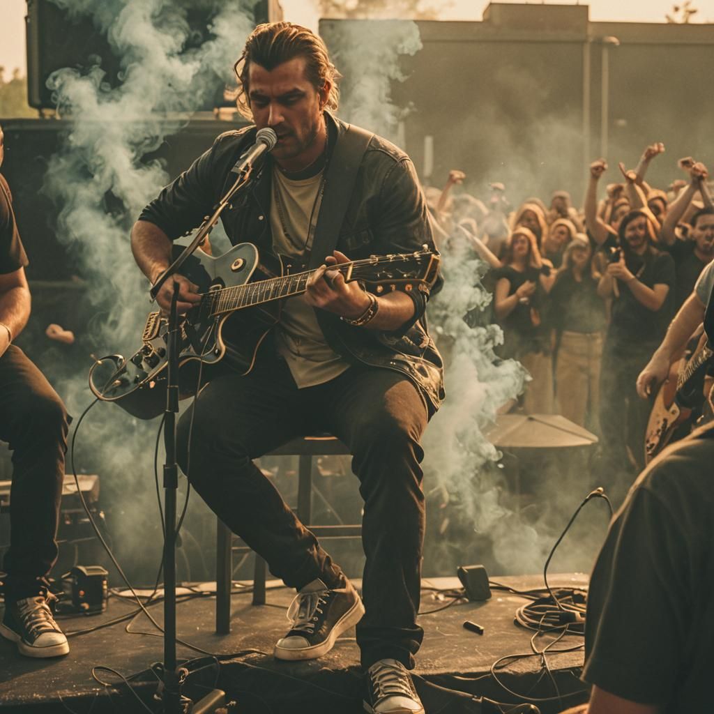 This image shows a rockstar performing on a huge stage. The shot captures a massive crowd, cinematic lighting, and golden hour colors. It's styled to look like a film still with grain and vibrant color grading.