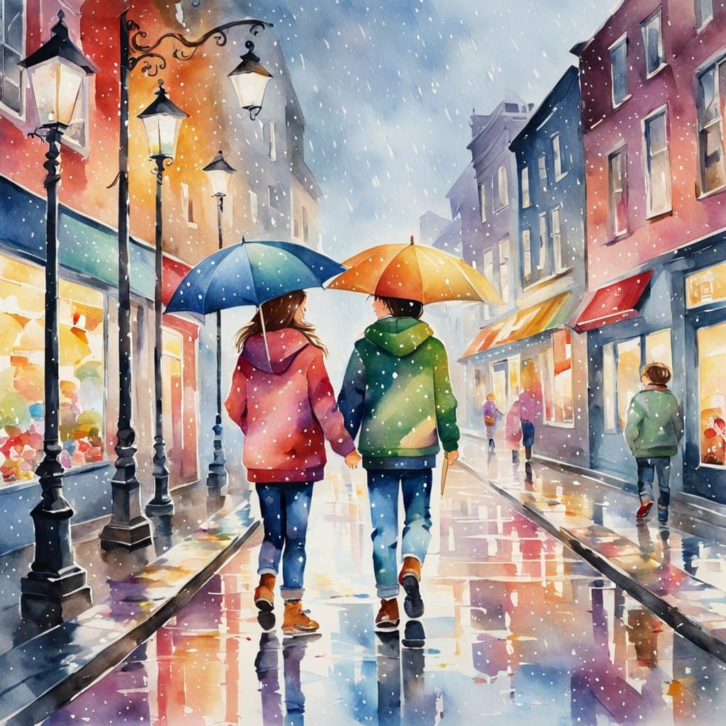 This vibrant watercolor painting captures the joy of two children on a rainy winter day, strolling down the street and savoring ice cream, with colorful streetlights reflected in the wet pavement.