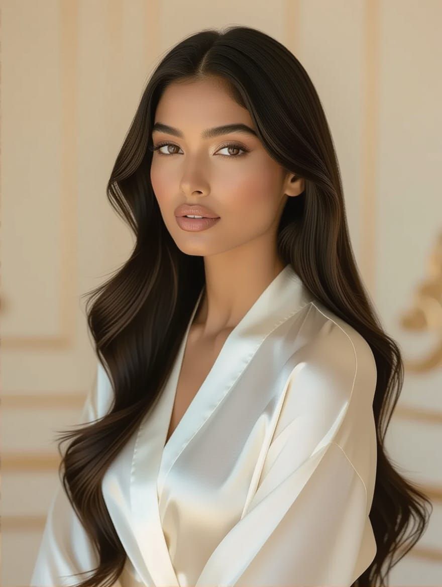A captivating portrait of an Indian woman with lustrous dark hair, radiant skin, and elegant makeup, posing in a satin robe. The image evokes art nouveau elegance and serene realism, enhanced by warm studio lighting.