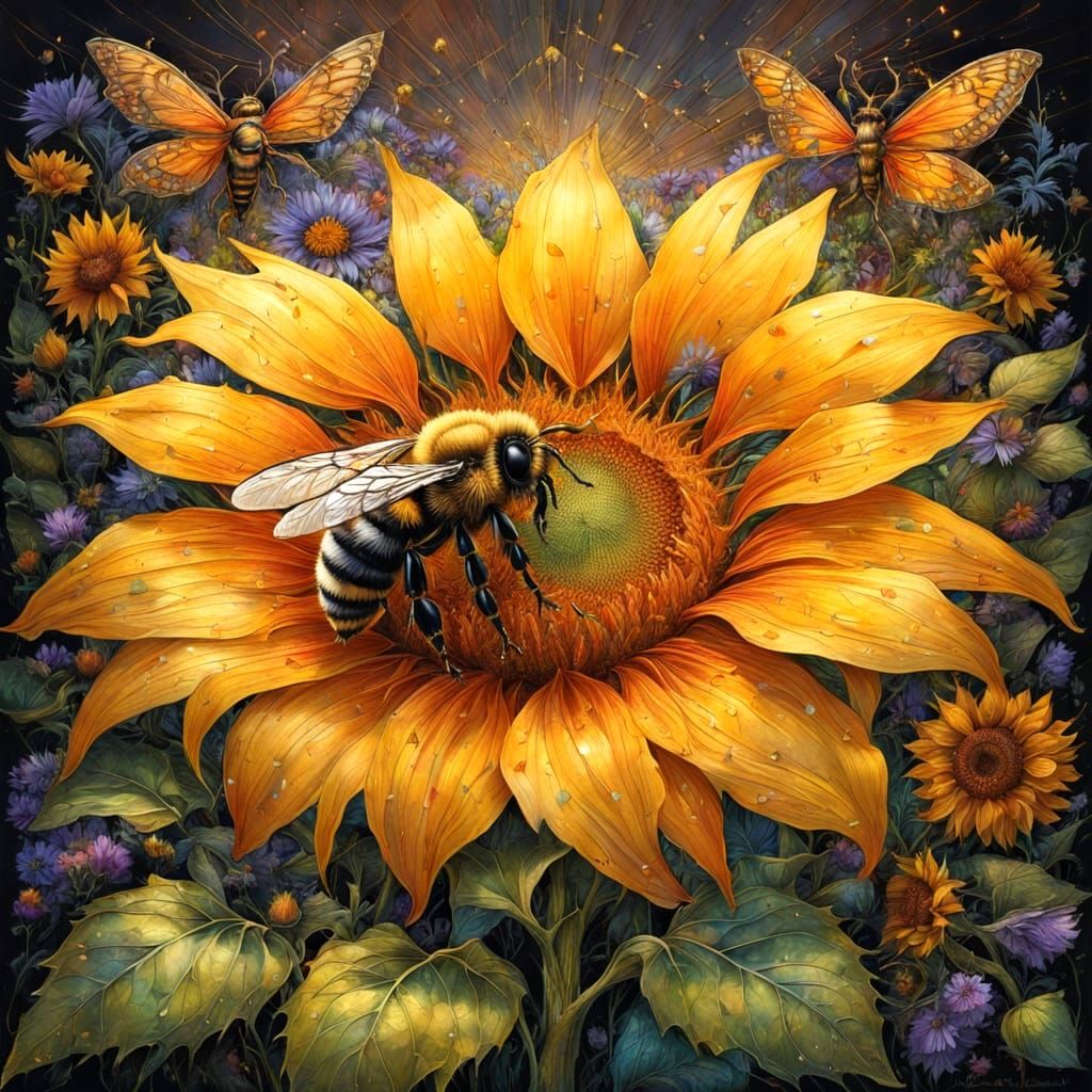 This image showcases a detailed bee amidst a vibrant wildflower scene, characterized by warm lighting, intricate motifs, and high contrast, creating a captivating seasonal art piece