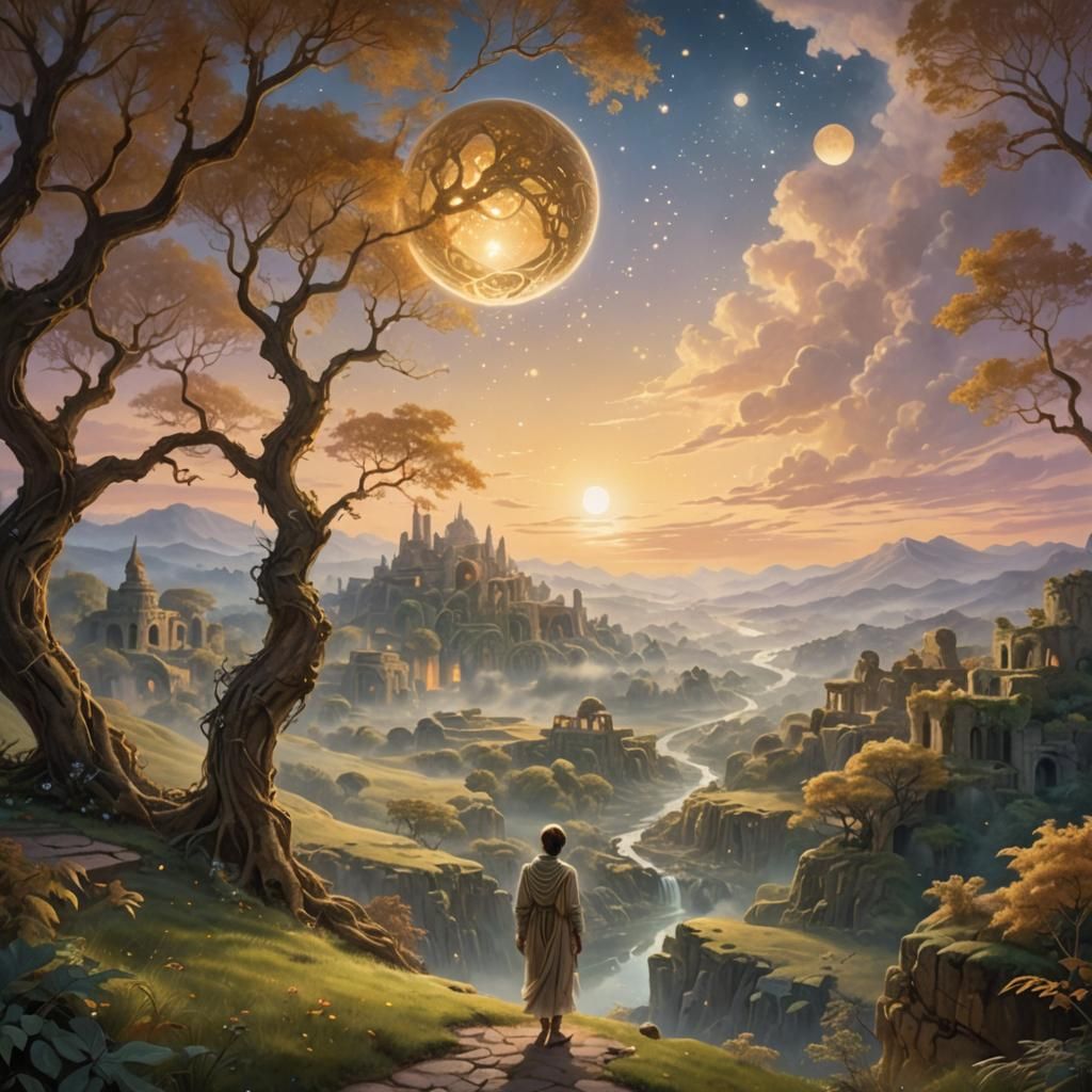 A striking picture of a mystical figure holding a glowing orb in a moonlit landscape. The fantasy concept art features detailed textures, intricate patterns, and glowing accents in complementary colors with soft lighting.