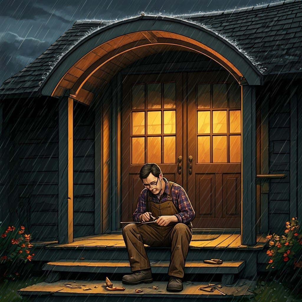This image shows a man carving wood on his porch during a rainstorm. Soft light emanates from the house, illuminating the cozy scene with muted colors, reminiscent of rural Americana in a nostalgic style.