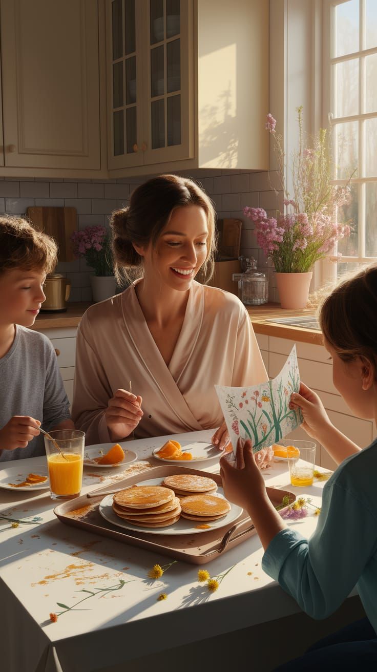 This heartwarming image captures a tender moment of a mother being surprised by her children with a homemade breakfast on Mother's Day. Soft lighting and painterly brushstrokes bring the cozy chaos to life.