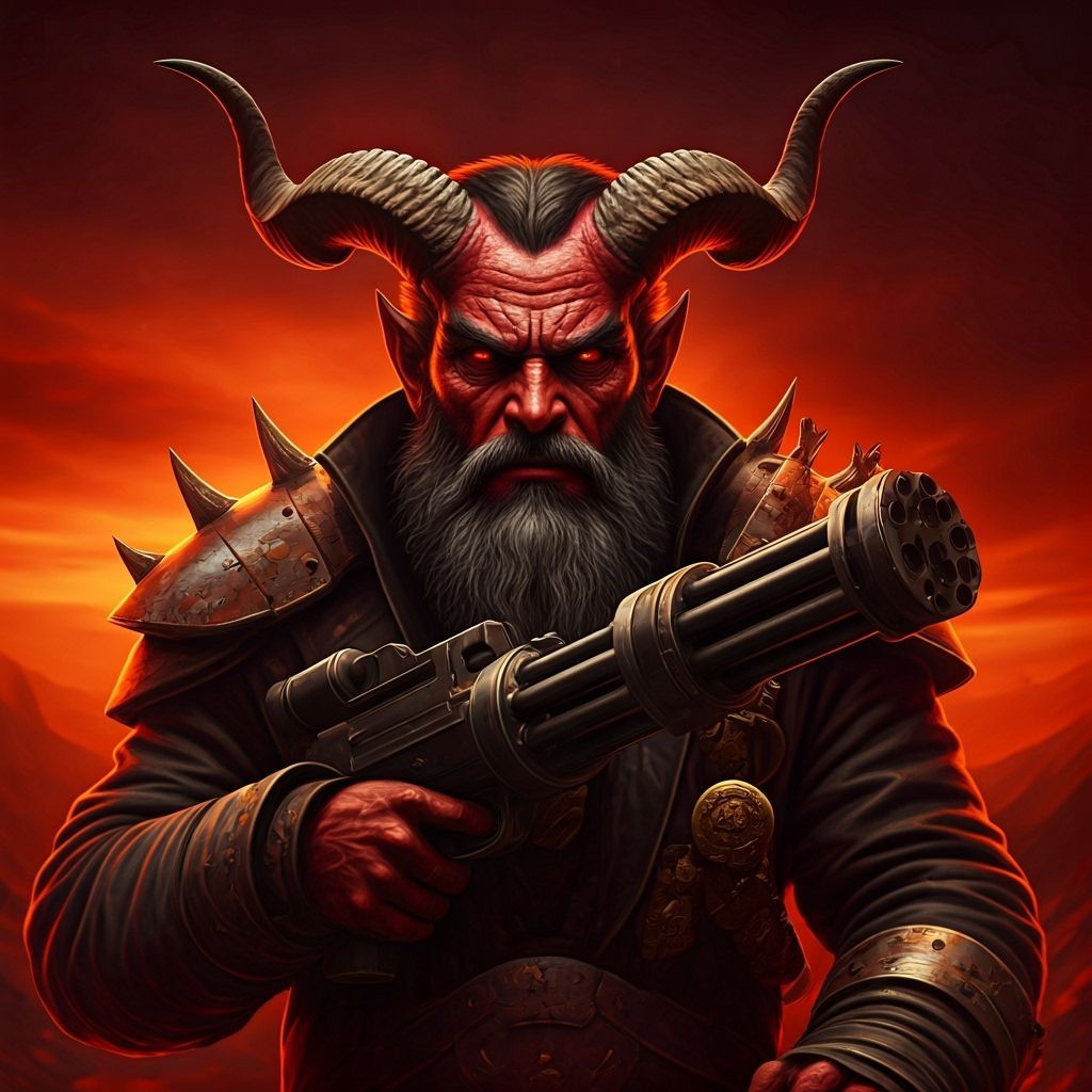 A striking picture of a snake-bearded devil in a retro sci-fi aesthetic. The devil wields a large minigun and wears a Mad Max-inspired ammo pouch under a blood-red sky in an apocalyptic setting. The image is reminiscent of a cinematic film still.