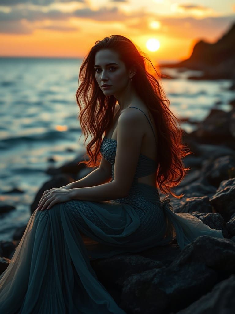 This image captures a serene mermaid sitting on a rocky coastline at sunset, lost in thought with a loving gaze, shot in a cinematic style reminiscent of classic film photography with warm lighting and rich color grading.