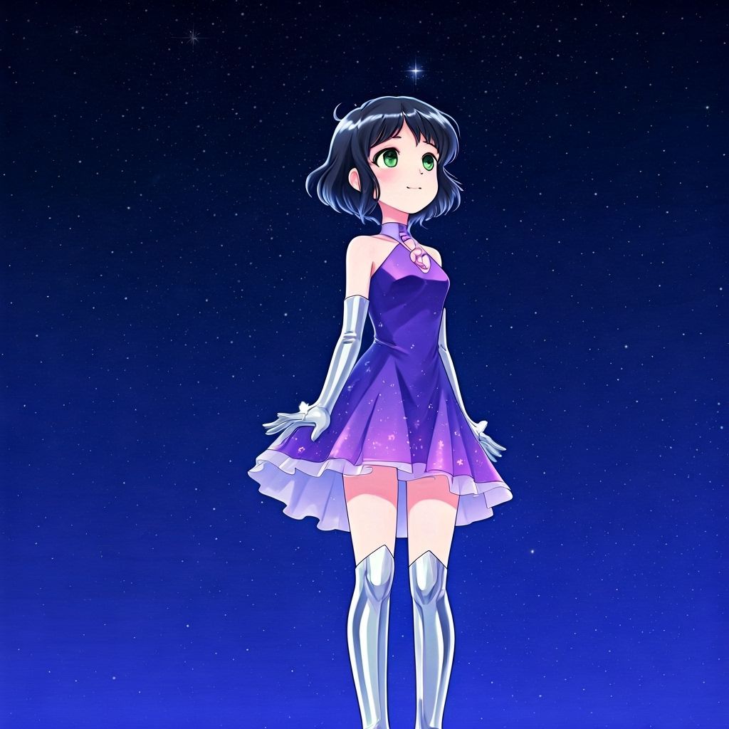 This image shows a manga-style girl with short black hair and green eyes gazing at a starry night sky. She wears a purple crystal dress and silver boots in this cel-shaded anime artwork.