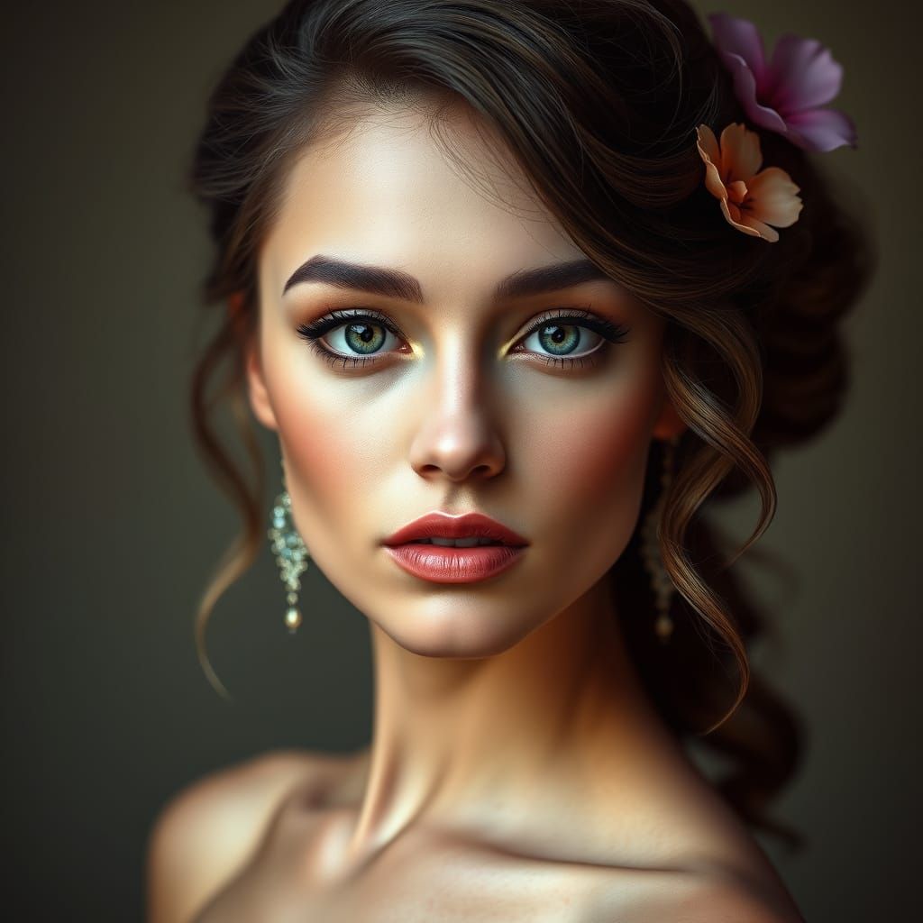 A stunning hyperrealistic photographic style portrait of Belleza Extraordinaria by Antonio López. The subject is a captivating woman with flawless skin and mesmerizing eyes, adorned with a delicate, intricate hairstyle. She exudes a radiant beauty, set against a simple yet elegant backdrop that highlights ...