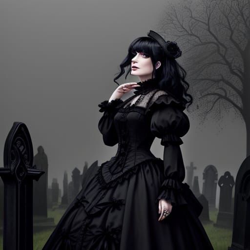 A striking picture of a mature cross-dresser in a Victorian gothic style. The subject is standing in a graveyard, wearing a feminine dress with daring lace details, captured in dark romanticism style.