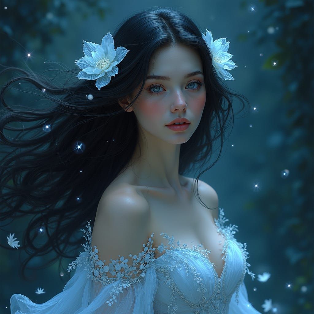 This image shows a beautiful woman with flowing hair adorned with glowing flowers, surrounded by a soft, ethereal light. The painting features intricate details and a sense of elegance reminiscent of Renaissance art, with a touch of Art Nouveau flair and fantastical realism.