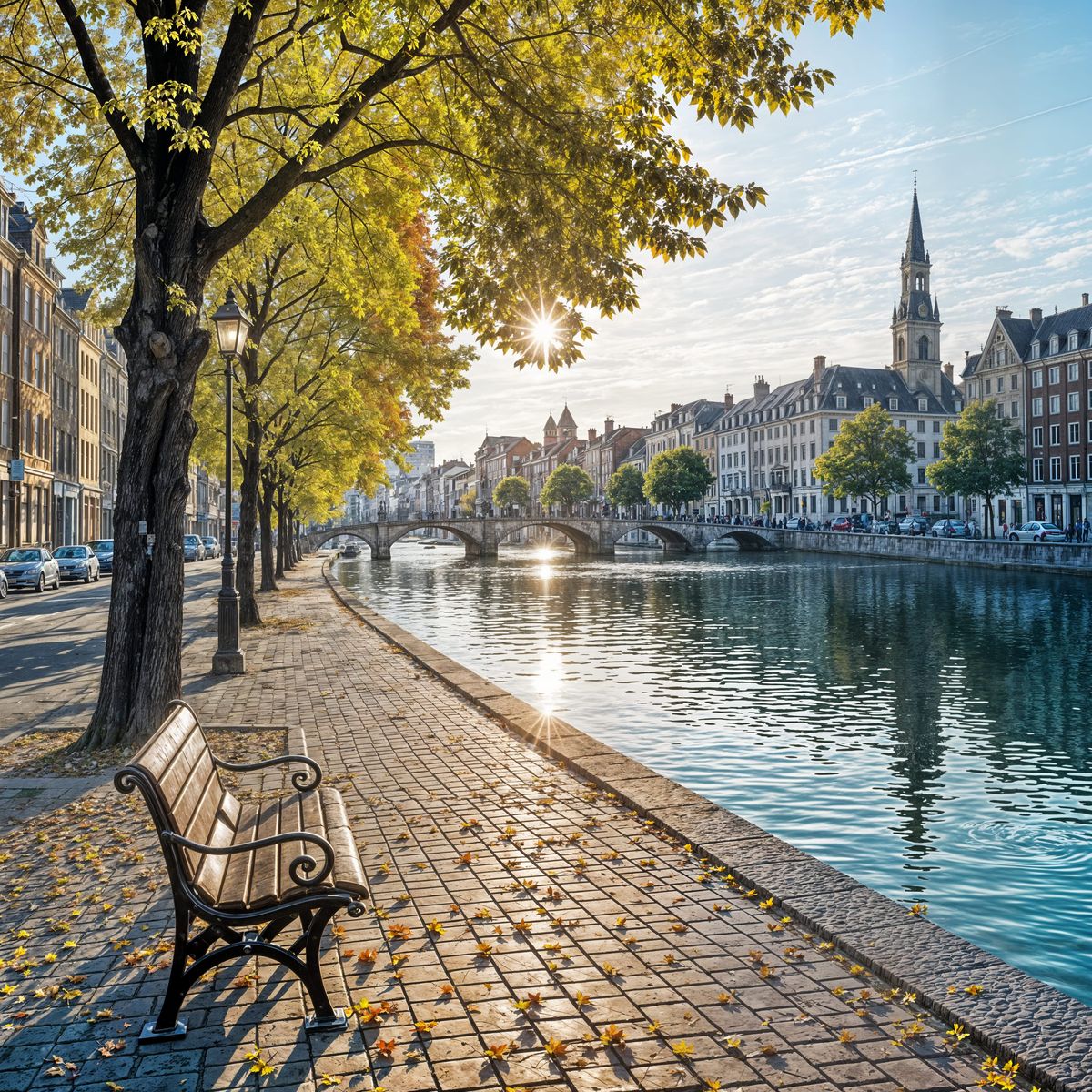 This image depicts a serene autumn morning with bright sunshine illuminating a wide street alongside a crystal-clear blue river. The scene captures the tranquil beauty of the season.