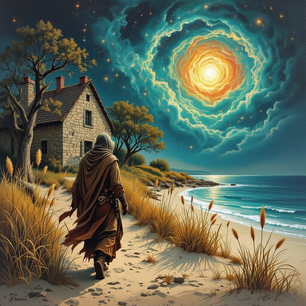 This image shows a time traveler stepping through a portal into a tranquil landscape. The surreal vista features a farmhouse, seashore, and swirling nebulae, rendered with vibrant colors in an acrylic art style.