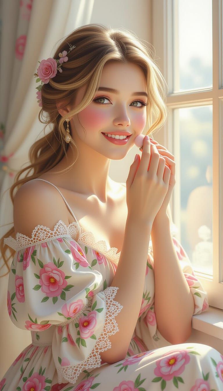 A beautiful portrait of a blonde girl applying blush, admiring her reflection in soft daylight. She is wearing a floral dress in vibrant orange and teal hues, with dynamic lighting and hyperdetailed textures.