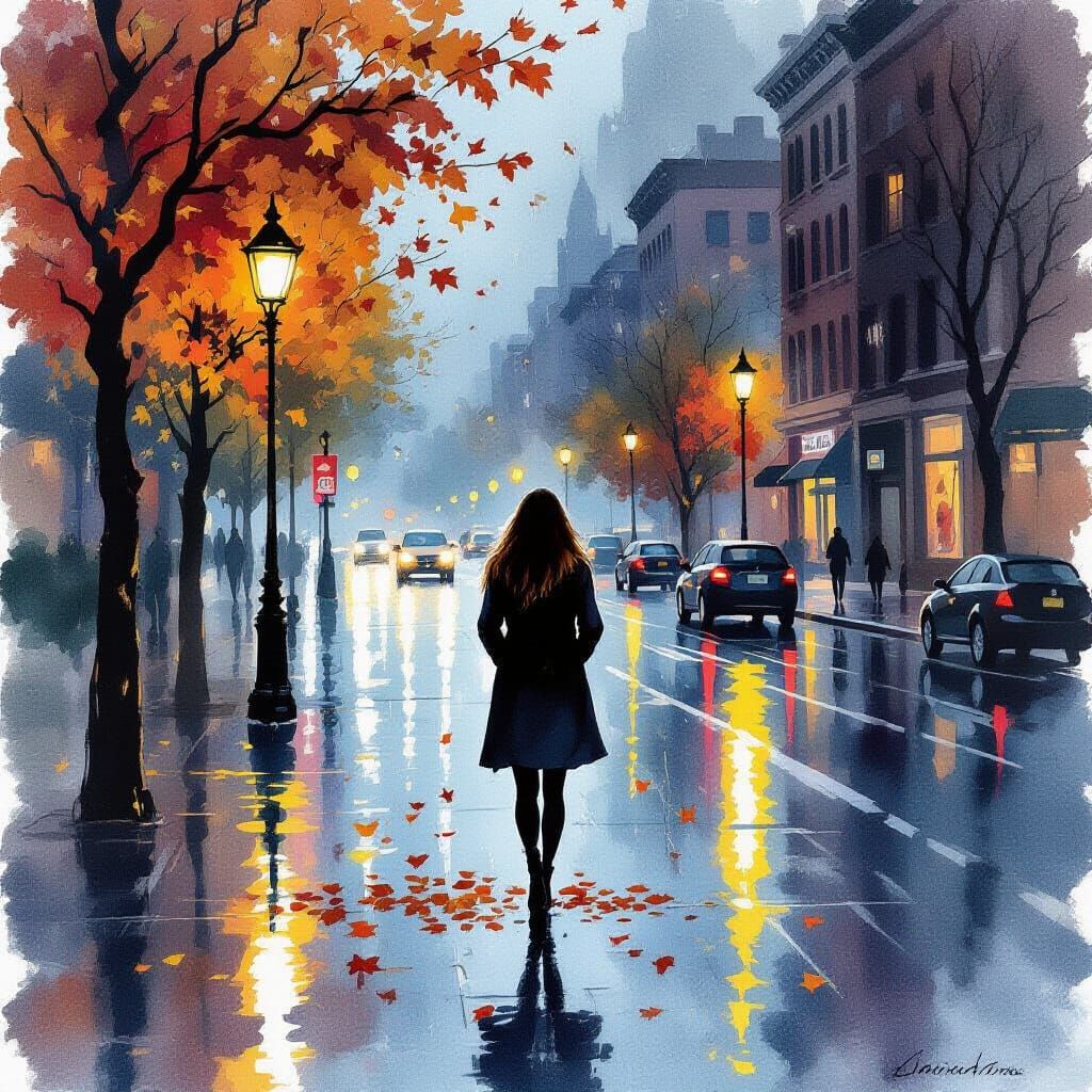 A lone woman stands on a wet city street at dusk, with streetlights reflecting. This image is rendered in a loose, expressive watercolor style with visible brushstrokes and bleeding colors.