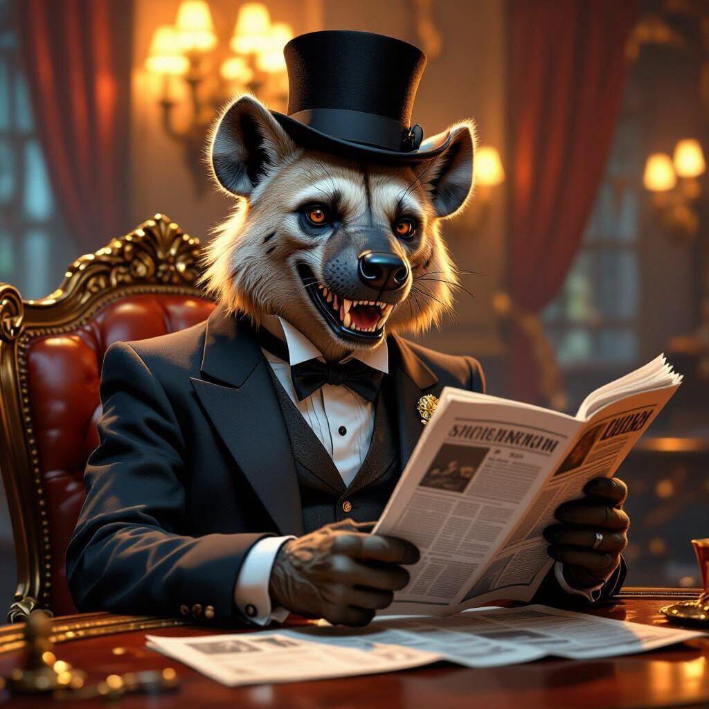 A sophisticated hyena in formal wear reads a newspaper at a fancy table. The image features warm lighting and complementary colors as digital art with intricate details and dramatic shadows.