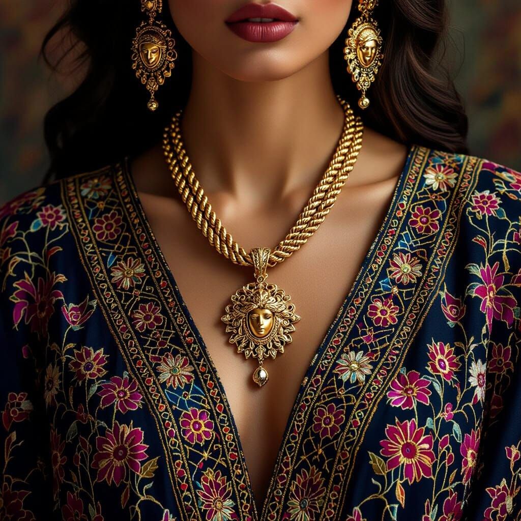 Design your own unique Medusa necklace images, featuring Moroccan women in traditional dress. Free and easy AI generation.