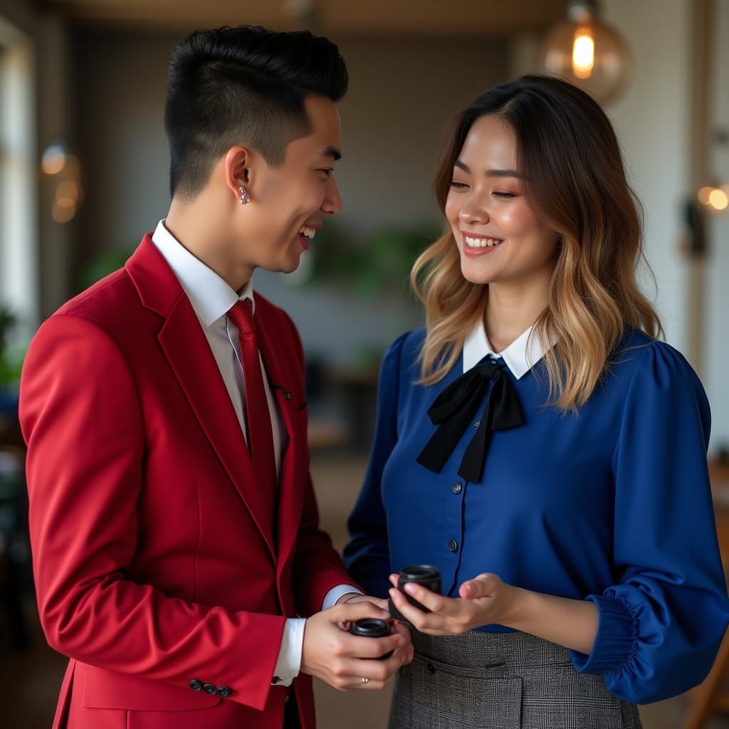 This image depicts an Indonesian reporter in a red suit excitedly presenting film to a Slovenian reporter in a vintage office. Professional photography with bokeh and natural lighting.