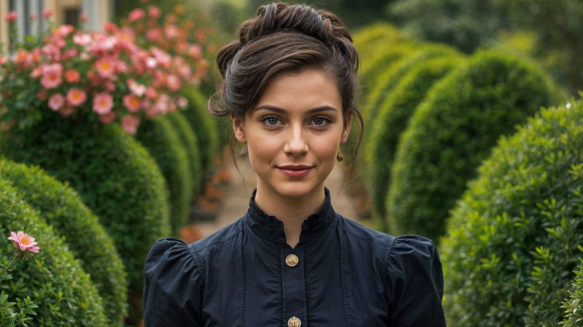 A serene portrait of a statuesque woman in a Victorian-era dress, set amidst a meticulously manicured garden with vibrant flowers and emerald-green bushes, evoking a sense of refinement and serenity reminiscent of a bygone era.