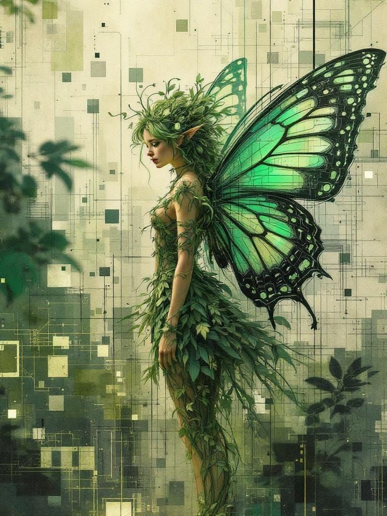 This image shows a wood sprite with green hair and butterfly wings, wearing a leaf skirt. The artwork blends Renaissance engraving with glitch art and industrial design elements, featuring meticulous linework and digital distortions.