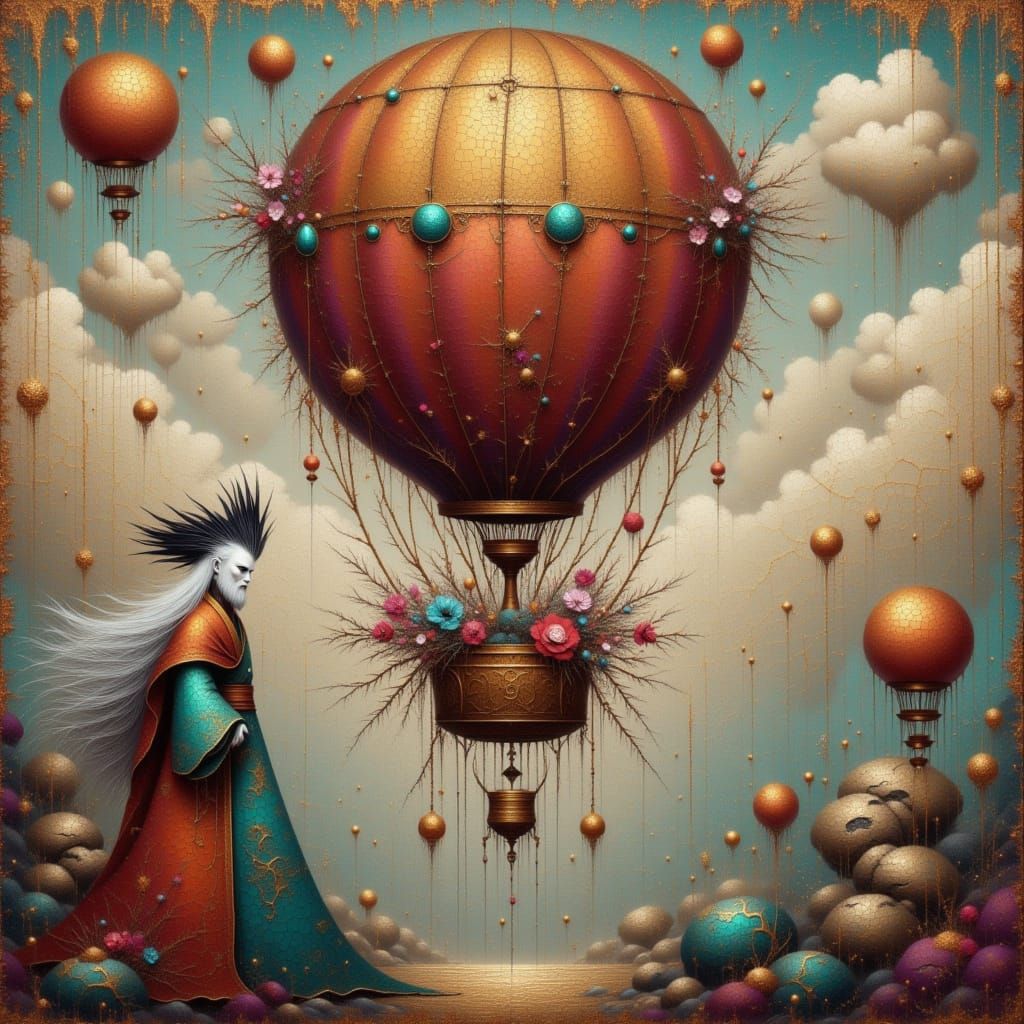 A fantastical steampunk hot air balloon soaring through the sky. The image showcases intricate mechanical details and a vintage aesthetic.
