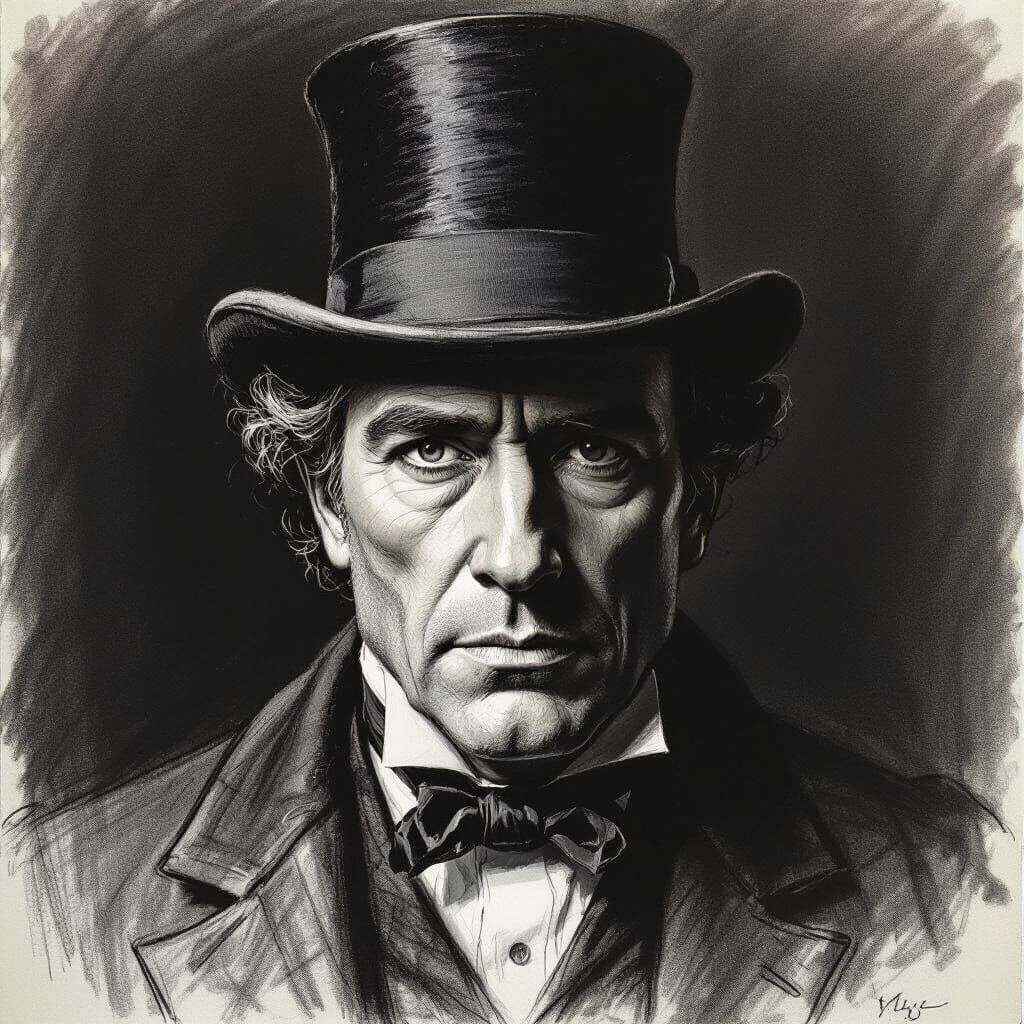 A hyperdetailed charcoal drawing of a man wearing a top hat, looking directly at the viewer. Features dramatic lighting and textured strokes, reminiscent of classic expressive portraiture.