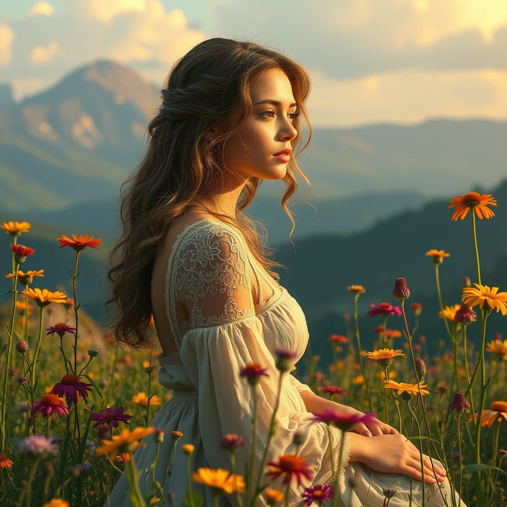 This image shows a serene woman in a landscape filled with wildflowers, bathed in golden light. The artwork evokes art nouveau elegance with intricate details.