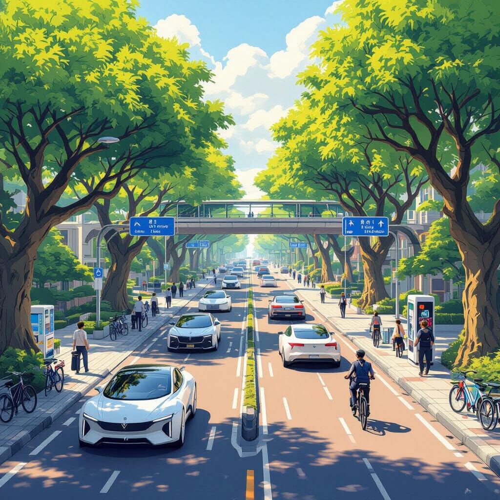 This image depicts a detailed concept art of a futuristic street. It features ancient trees, dual carriageways for electric cars and bikes, and dynamic lighting, creating a captivating urban scene.
