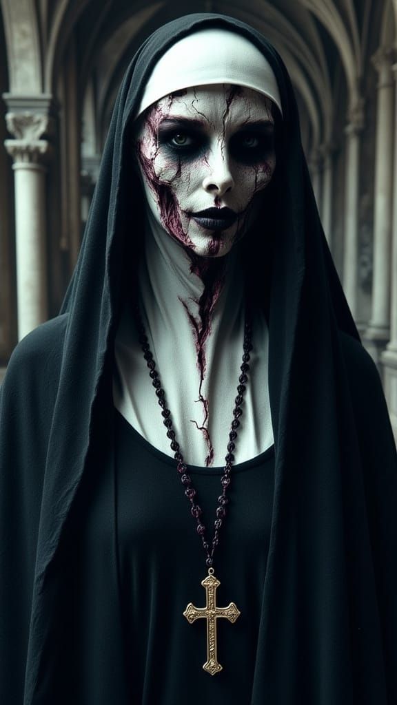 This image shows a terrifying, corrupted nun amidst gothic cathedral ruins. The artwork blends cosmic dread with Vatican horror, featuring tattered vestments, porcelain skin, and abyssal eyes in a surreal style.