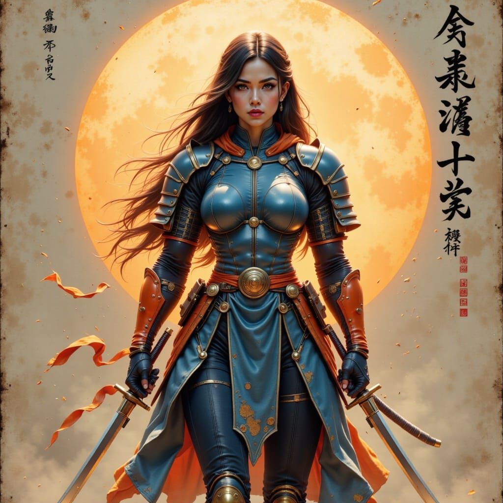 A powerful female samurai stands ready with two katanas, clad in detailed blue and orange armor. Set against a glowing circle and aged paper texture, this image has a painterly, dreamlike quality.