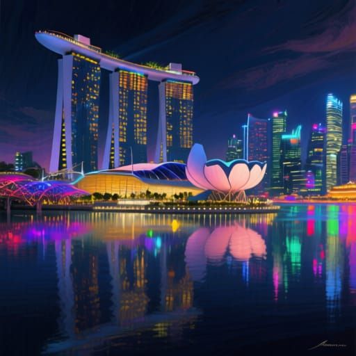 A vibrant digital painting captures Marina Bay Sands, Singapore, illuminated against a futuristic city skyline. Features glowing skyscrapers and a shimmering bay, evoking a majestic atmosphere.