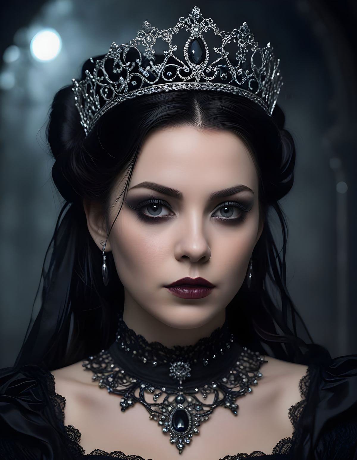 A striking image of a gothic princess in a black Victorian dress, adorned with a chocker, silver tiara, and intricate silver jewelry, evoking a sense of mystery and elegance.