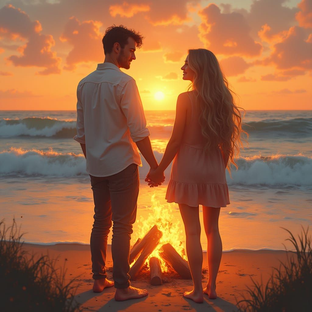 A couple stands hand-in-hand before a beach bonfire at sunset. Golden light reflects on the waves in this dreamy, romantic scene. The image has an ethereal, whimsical style.