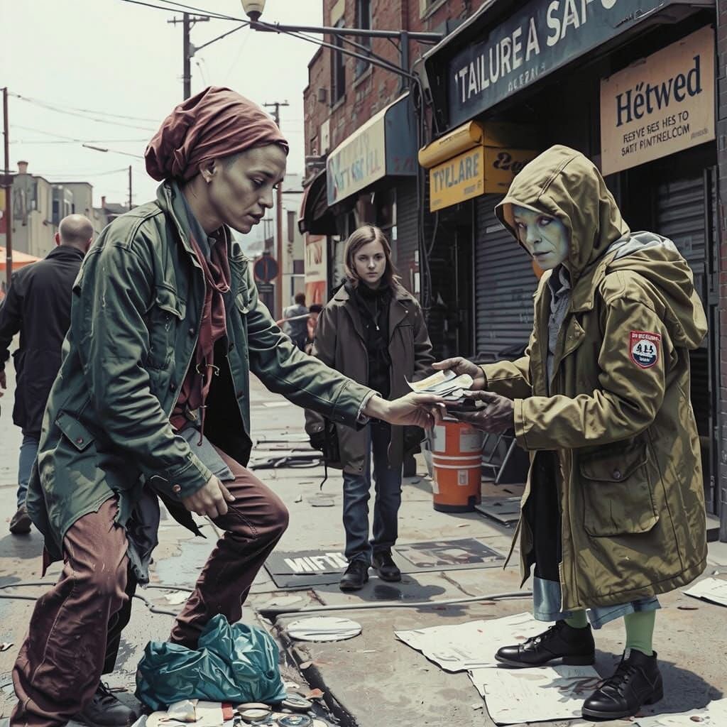 This image shows a homeless alien in a tattered coat begging for change on a filthy, neon-lit street. The alien encounters a working girl, sharing secrets in a dystopian future with emotive expressionism.