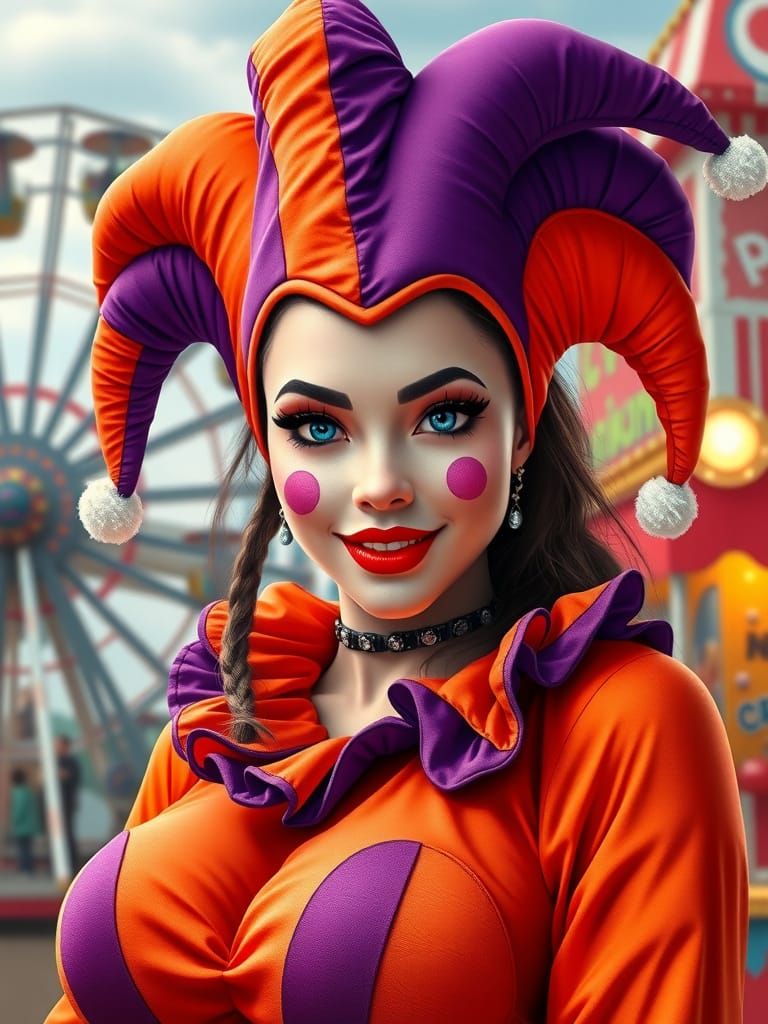 This detailed, realistic image shows a voluptuous female jester in orange and purple attire, smiling with bright blue eyes, set against a lively carnival scene with a Ferris wheel and carousel.