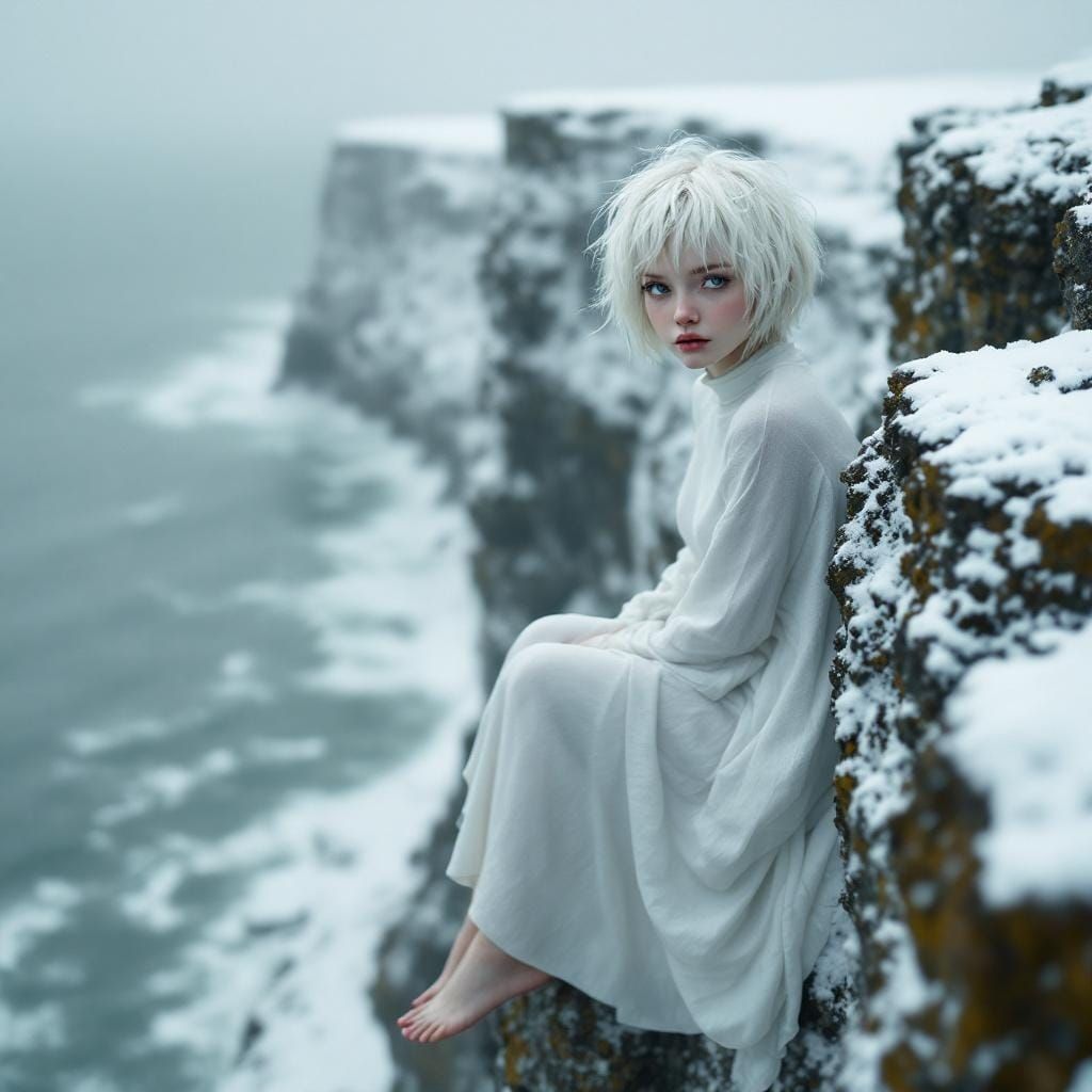 A hyperrealistic image of an albino woman with short white hair and gray-blue eyes sitting on high cliffs overlooking a stormy sea. The scene is reminiscent of surrealist paintings and atmospheric landscapes.