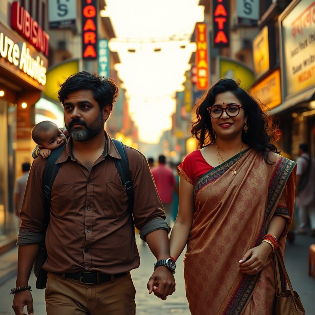 This image shows an Indian couple strolling through a lively market at sunset. The man carries a baby while the woman holds his hand, surrounded by upscale shops in a cinematic, color-graded style.