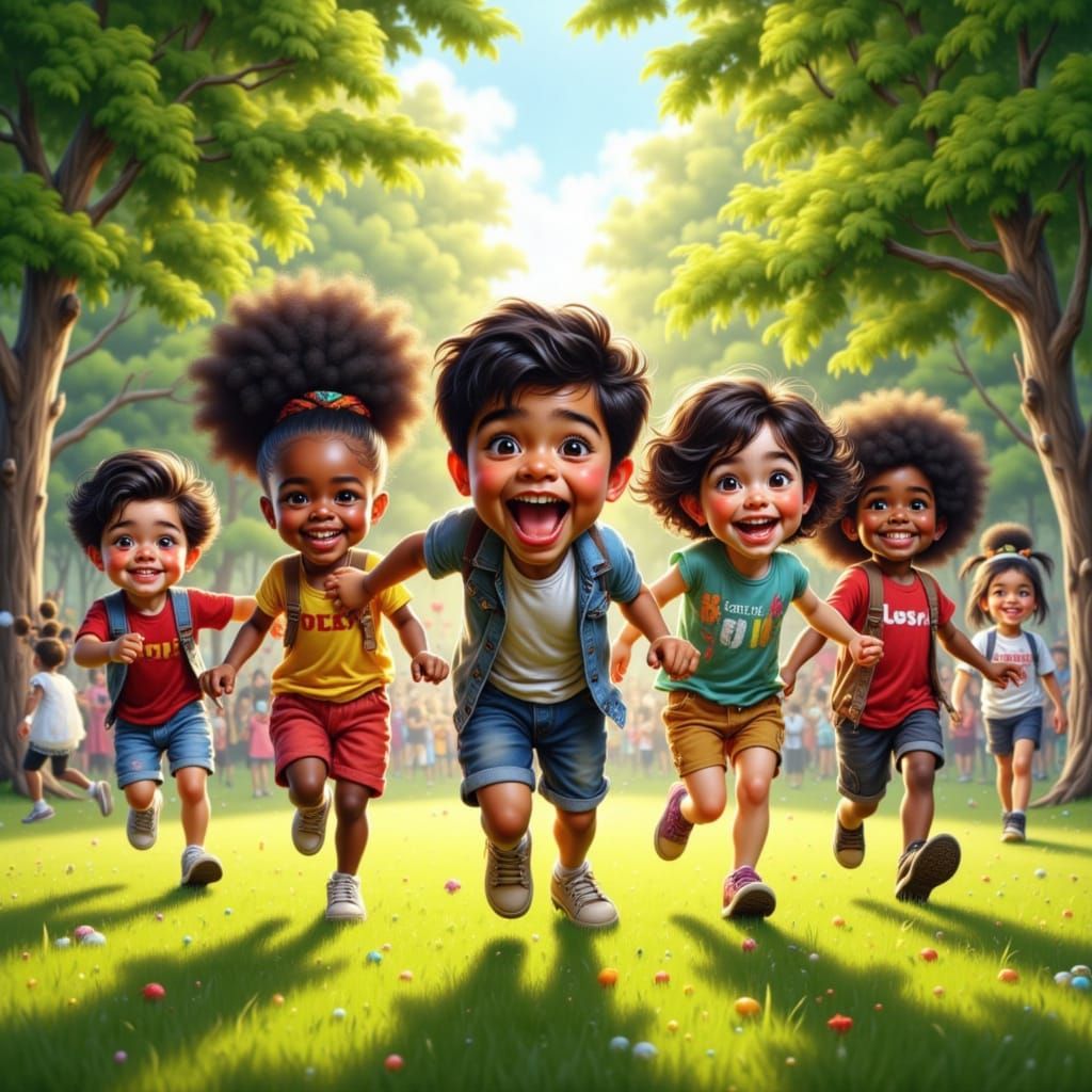 This image shows a vibrant scene of children of all backgrounds playing together harmoniously in a sunlit park. The focus is on authentic moments of connection and carefree joy, emphasizing inclusivity and a shared childhood experience.