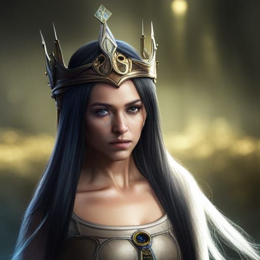 A digital painting of a young queen with long black hair wearing a crown. The artwork features intricate details, deep colors, and a fantastical aesthetic in 8k resolution.